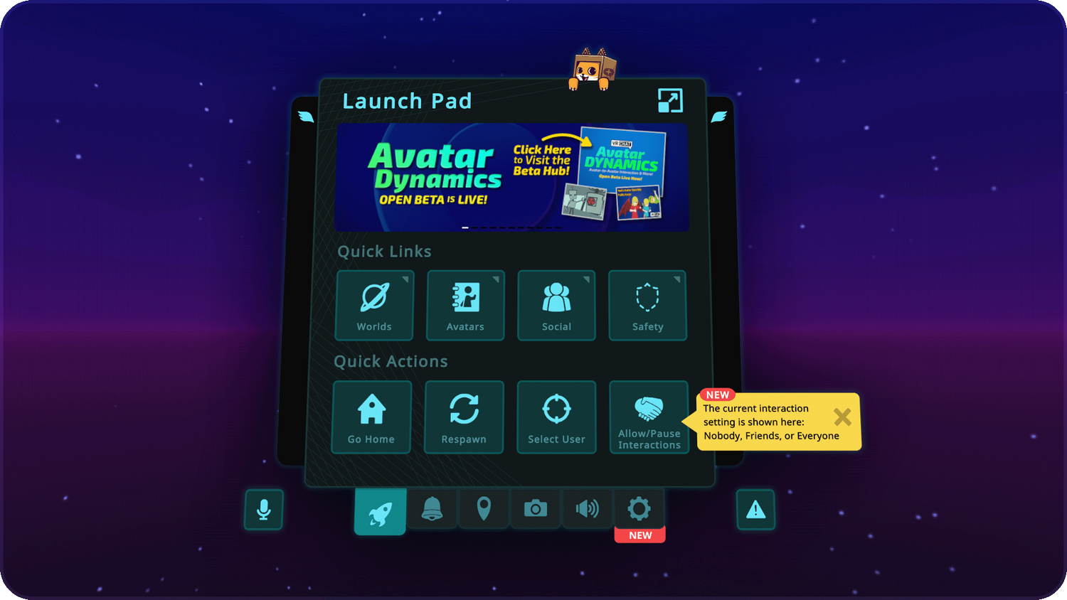 絵文字ボタンが消え、Avatar Dynamicsボタンがその場所に入りました。自分のアバターインタラクションが「誰も許可しない」「フレンドだけ許可」「全員許可」の設定に応じて変わります。これで一瞬で設定がわかるわけです。