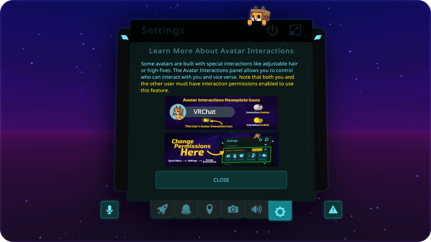 最初に設定タブを開いたら、アバターインタラクション許可設定の基本を教えるポップアップが表示されます。見逃した?Learn Moreボタンでいつでも呼び出せます。